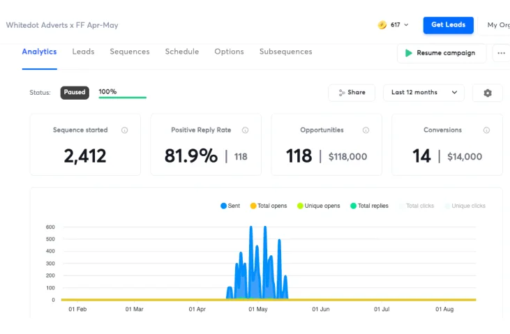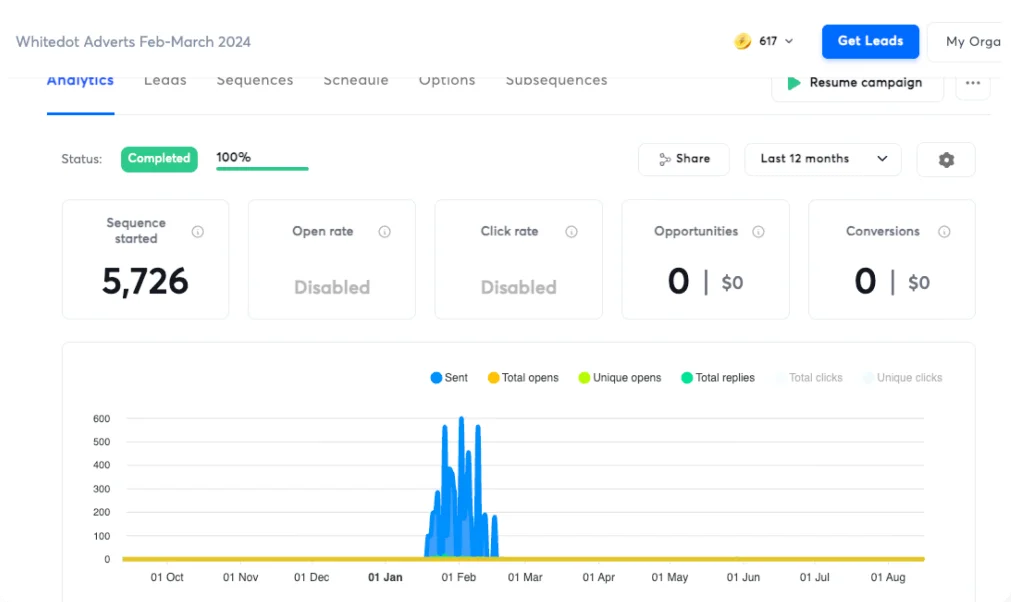 5726 email sequences started over 35 days and 0 calls booked. 0 Appointments.